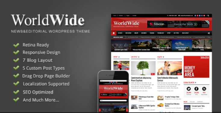 World Wide is a premium magazine wordpress theme. With this theme, we include 7 blog styles + 5 styles of sidebar layout. Now you can have many possibilities for your site. Also, You can change many setting such as element’s color, Backgroumd pattern, font family etc? easily via our awesome admin panel.